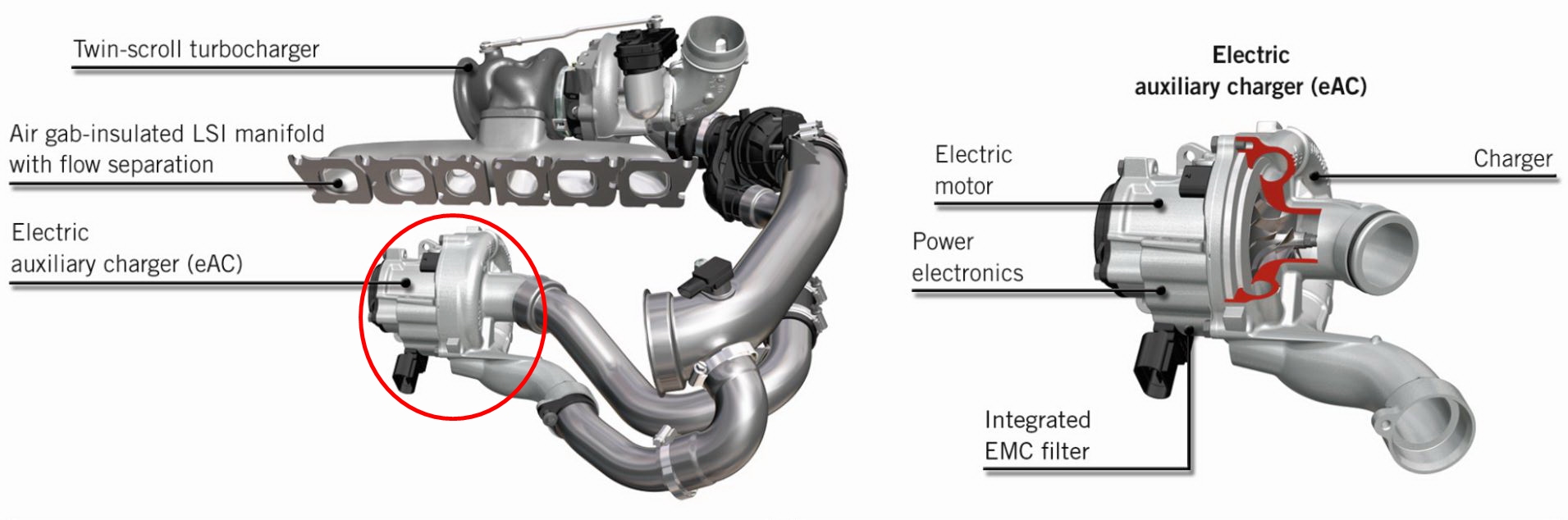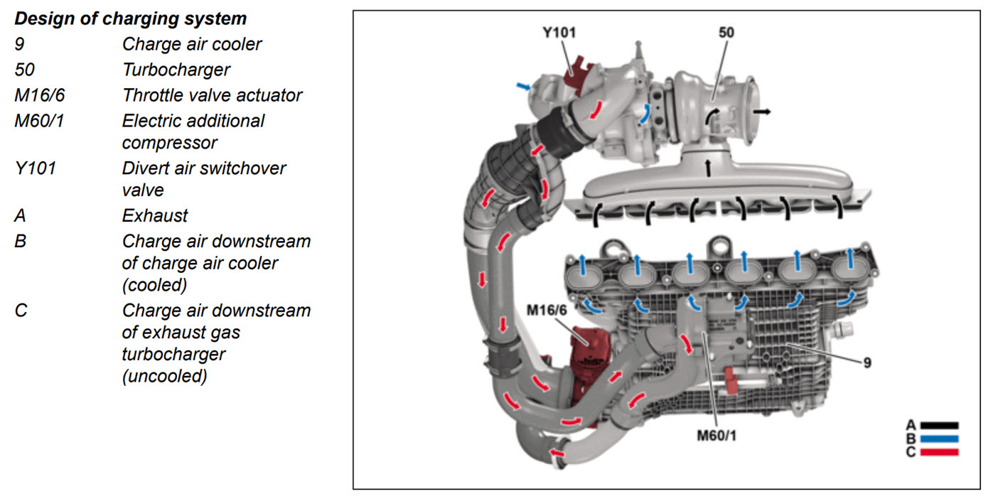 전자식터보차저를 이용하여 터보랙을 없애고 출력을 보강합니다.