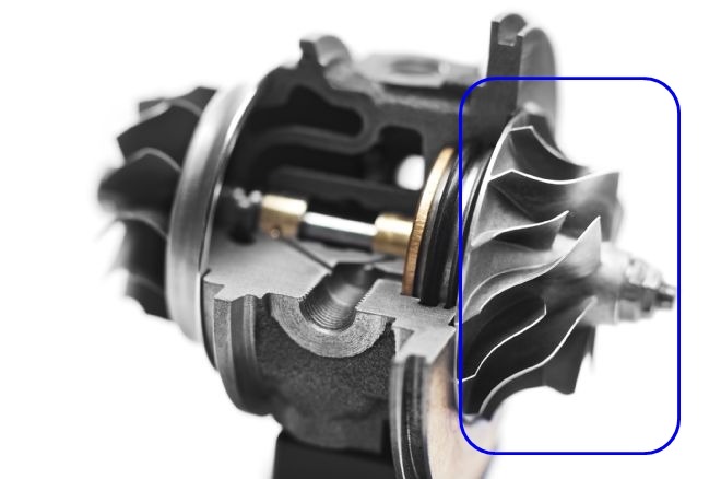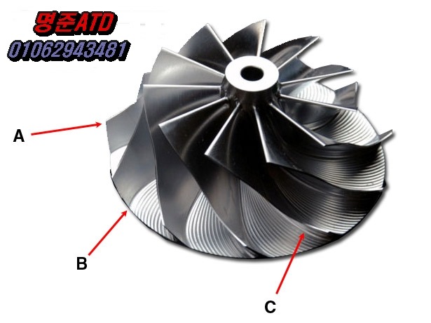 터보차저 이야기/터보차저 기술 및 정보 터보차저이야기-compressor wheel <명준 Turbo ATD> 명준 Turbo ATD 2018. 3. 25. 14:09 압축compressor wheel 에 대한 이야기입니다. 터보관련문의: 010 6294 3481 정품신품터보와 터보엑츄에이터 중국산터보, 중고터보는 취급하지 않습니다. 차대번호와 엔진형식으로 문의하면 보다 정확한 정보를 제공해 드립니다. 과급(charger)시스템은 크게 터보차저와 슈퍼차저로 나누어집니다. 각각은 장단점이 있지만 추세는 터보차저가 주를 이룹니다. 터보차저는 가솔린터보차저. 디젤터보차저, 최근엔 전자식터보차저로 나눌수 있습니다. 가솔린터보 turbocharger cutaway 2장 디젤터보의 특성을 보여주는 cutaway 사진(가솔린터보와는 달리 디젤터보는 베인이 부착(파란색네모) 전자식터보차저 아래 네모칸의 부속품(compressor wheel)에 대한 이야기입니다. CHRA-splitter blade wheel design 요즘은 터보고장에 대한 문의가 들어오면 고장원인이나 새로운터보 또는 튜닝터보에 대한 이유를 물어보는 분들이 많습니다. 사전지식이 매우 풍부한 분들도 많은 분들도 있고 남들이 하니깐 나도 해 보겠다는 분들도 있습니다. 재생이나 중국산터보를 찾는 경우도 많이 봅니다. 이를 권유하는 업체는 거르는 것이 좋습니다. 제가 보는 입장에서는 위험한 발상들이 많습니다. 최신의 다운사이징터보차저는 분당30만 rpm(초당 6,000회전)이상을 회전하는 것들도 있습니다. 경험이나 호기심등 기타등등의 이유로 터보를 분해해 보신 분들은 단순한 구조에 인터넷에서 구입한 터보부품으로 조립을 하는 경우가 있습니다. 혹은 인터넷에서 구입한 조악한 터보를 장착하여 사고를 치는 경우도 많이 봅니다. 터보차저의 구조와 특성을 알고 있으면 선택에 도움이 되고자 합니다. 하나씩 살펴보도록 합니다. 먼저 compressor입니다. compressor는 두개의 주요한 구성부품으로 이루어져 있습니다. compressor wheel과 compressor cover 입니다. 정확한 용어를 알아야 터보차저와 엔진시스템과의 매칭관계, 재생, 그리고 터보고장의 원인을 이야기하는데 도움이 됩니다. 단순히 '골뱅이' , '터보압축하우징'등의 용어로 설명하는 것이 아직도 현실입니다. compressor을 이해하기 위해 기본적인 열역학원리를 간략하게 소개해야 합니다. PV / T =상수 ( P = pressure of the gas, V = the volume it occupies, T = the temperature of the gas) 부피가 일정하고 온도가 상승하면 이에 비례하여 압력이 증가, 반대로도 해석할 수 있습니다. 주목할 점은 상수(일정한 값)에 의미를 두시면 됩니다. 튜닝은 저의 분야가 아닙니다. 다만 위의 원리를 이해해야 어떻게 그리고 왜 부스트압력을 이용하여 최대한의 출력을 이끌어낼수 있는지 알수가 있습니다. Turbocharger compressor은 intake air을 효율적으로 압축을 잘 하는데 목적이 있습니다. 각각의 compressor는 모양에 따라 optimum flow efficiency, maximum flow capacity (choke)가 정해져 있습니다. 아주 이상적인 compress에서도 대략 76%가 한계로 알려져있습니다. 1. compressor wheel은 터보부품중에서도 가장 많이 거론이 되는 부품입니다. 터보차저 compressor wheel을 'radial compressor'이라고 합니다. 90 도 방향으로 배출하기 때문입니다. 반면에 jet engine의 compressor wheel은 같은 방향으로 배출을 하기 때문에 'axial compress'이라고 합니다. The compressor wheel has a number of critical areas, many of which are changeable within turbocharger model families, resulting in the various trims available to adjust flow parameters and correctly match the compressor to the engine. These changes must not be done by the turbo owner and must be done by the manufacturer at the time the turbo is manufactured. Changing these shapes by the turbo owner will destroy the design relationship between the compressor wheel and the compressor cover contour. Most compressor wheels have been made from various aluminum alloys. However, there are more and more applications that push the limits of what the current aluminum alloys will stand. The higher the rotational speed of the aluminum, the shorter the life cycle. This is typically not a problem in most performance automotive applications due to the relatively low hours of operation. However, in some extreme high-boost applications, such as tractor pulling, this can pose a problem with wheel burst. The compressor wheel has several important areas of design consideration: (1) inducer diameter, (2) tip height or tip width, (3) wheel contour, (4) splitter blade, (5) full blade, (6) backwall, (7) wheel diameter, tip diameter, or exducer diameter, (8) tip, impellor, or exducer, and (9) nose. (Courtesy Diesel Injection Service Company, Inc.) While most compressor wheels are a casting, this compressor wheel has been machined from billet. Careful examination of the wheel floor reveals the machining marks left after the formation of the wheel’s hub as the blades were made. This process is done by a five-axis milling machine and is used in special low-volume, high-durability, or high-performance applications where no production wheel will fit the intended need. These types of wheels are tremendously expensive but are justifiable in many instances. (Courtesy Diesel Injection Service Company, Inc.) This compressor wheel has been cut in half. The shaft bore (1) typically runs all the way through the wheel, the compressor wheel hub (2) supports the blades and its shape forms the wheel floor (3) that turns the inlet airflow 90 degrees to make it a radial-type compressor. Some wheels will have a