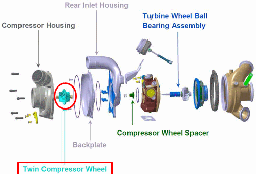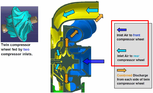 터보차저 이야기/터보차저 기술 및 정보 VNT DualBoost Technology과 Gasoline DualBoost 터보처저<명준 Turbo ATD> 명준 Turbo ATD 2014. 4. 13. 20:16 DualBoost Technology 터보관련문의: 010 6294 3481 신품정품터보( 착한 가격 )판매 터보는 정품으로 사용하는 것이 연비와 출력에 손해를 보지 않습니다. 비정상적인 터보와 20%의 차이를 보입니다. 비정상적인 중국산터보, 모조터보,중고터보는 취급하지 않습니다. 요즘 신형차에 부착되는 터보는 이전의 터보와는 완연히 다른 부품이 많이 사용됩니다. DualBoost Technology라는 새로운 터보차저를 살펴봅니다. 1. VNT DualBoost Technology 2009년에 가렛트 하니엘의 홈페이지에 간략하게 이런 기사가 뜹니다. Honeywell has unveiled its groundbreaking VNT DualBoost turbocharger on Ford’s all-new 6.7-Liter V-8 Power Stroke diesel engine. Honeywell’s newest single turbo technology delivers turbo benefits approaching those from dual-stage configuration. (새로운 싱글터보기술이 듀엘스테이지터보의 장점을 가진다) 6.7-Liter V-8 Power Stroke diesel engine 사진 엔진스펙 6.7L Power StrokeDisplacement: 406 ciBore x Stroke (inches): 3.90 x 4.25Configuration: V-8Compression Ratio: 16.2:1Engine Block: Deep-skirt, compacted graphite iron (CGI)Cylinder Heads: Aluminum, reverse-flow coolant circuitValvetrain: Four overhead valves (OHV), four rocker arms, and four pushrods per cylinderOil Capacity: 13 quartsInjection System: Bosch electronic high-pressure common-rail (30,000 psi max.)Injection Pump: Bosch CP4.2Injectors: Bosch piezoTurbocharger: Garrett single sequential (SST) with variable-geometry (VGT) exhaust housing, two compressor wheels, and two inducers 싱글 시컨셜(SST)이란 새로운 용어가 보입니다. 두개의 컴프레셔 훨과 두개의 인듀서Charged Air Cooling: Air-to-waterEmissions Equipment: Exhaust gas recirculation (EGR), diesel oxidation catalyst, selective catalyst reduction (SCR) utilizing urea injection, and diesel particulate filter (DPF)Biodiesel Compatibility Rating: B20Horsepower: 390 hp at 2,800 rpmTorque: 735 lb-ft at 1,600 rpmEngine Weight: 970 pounds 요런 차에 달린 엔진 엔진 뒷쪽면 사진과 터보차저 위치 아래그림 single sequential (SST) with variable-geometry (VGT) exhaust housing, two compressor wheels, and two inducers 화살표를 보시면 두개의 컴프레셔훨이 마주보고 있는 형상으로 두개가 보입니다. 참고로 아래그림은 일반적인 VNT터보 컴프레셔훨이 하나입니다. 아래위 사진을 유심히 비교해 보십시요 . 보는김에 터보차저명칭도 봅니다. 역시나 컴프레셔훨이 단면에 하나입니다. A. Compressor wheelB. Turbine wheelC. Variable vanesD. Exhaust turbine housingE. Compressor housingF. BackplateG. Turbo shaftH. Oil-supply lineI. Water cooling line VNT DualBoost Technology 참고동영상입니다. 볼베어링방식입니다. 상용차에 점차로 적용을 시키는 것을 보면 내구성문제도 어느정도 확보가 된듯한 느낌입니다 사실 DualBoost turbocharger 란 개념은 공장용이나 산업용터빈에서 오래전부터 사용을 한 기술입니다. 이를 축소하여 자동차용터보에 응용을 한 것이 기술이죠.. 아래는 발전소용 터빈입니다. 컴프레서훨이 한두개가 아닌 복열로 구성되어 있습니다. Honeywell은 기술적인 부분을 서술해 놓았습니다.(관심있는 분만 읽으시기 바랍니다) 제 느낌에는 기존의 기술을 더 정밀하게 응용. 강화를 한 것 같은데...... DualBoost combines the vane cartridge concept used on our latest 3rd Generation VNT™ turbos, which separates the turbine housing from the vane assembly for improved reliability and performance, with the variable vane assembly of the AVNT™ (Advanced VNT), which has proved such a reliable performer with our US customers. In addition, the turbine housing incorporates a single wastegate valve to enable the use of an even smaller turbine for improved response at low engine speed while further widening flow capability. The control for the variable vanes is also different to that used on passenger car turbos, as it is electro-hydraulic. The actuator is a powerful hydraulic unit, integrated into the center housing casting, which uses engine oil acting on a power piston to move the vanes through an internal rack and pinion gear. The flow of oil to the actuator is controlled by a variable solenoid valve, which receives its demand signals directly from the vehicle ECU via a single electrical connector. The high powered actuator is needed on this application because the engine runs with very high levels of EGR (Exhaust Gas Recirculation) in order to comply with the latest US emissions regulations. The variable vanes can be moved towards the closed position on demand, which increases the back pressure in the exhaust manifold and literally “drives” the inert exhaust gas back towards the lower pressure in the air inlet manifold to help reduce regulated emissions. This is only possible using a VNT with a high powered actuator. The torque from the turbine wheel is transmitted to the compressor with minimal power losses, due to the use of an advanced angular contact ball bearing system. This uses light weight, low inertia and highly durable ceramic balls at both ends of the cartridge, performing the combined functions of a journal bearing and thrust bearing system in a single compact assembly. The ball bearing systems have derived from many years of experience gained in our highly successful race/rally/performance turbo range; proven repeatedly in numerous World Rally and Le Mans series wins! Unusually, the turbo in this application sits on its own integral pedestal in the middle of the Vee, on top of the engine. The pedestal and turbo also include quick connectors for oil and cool