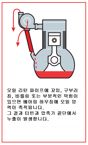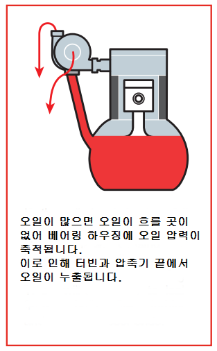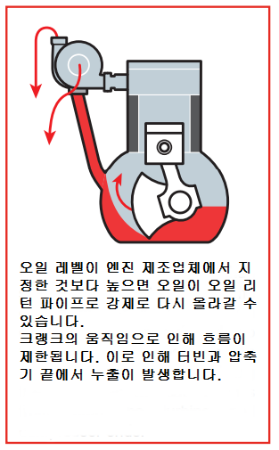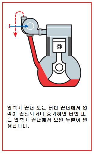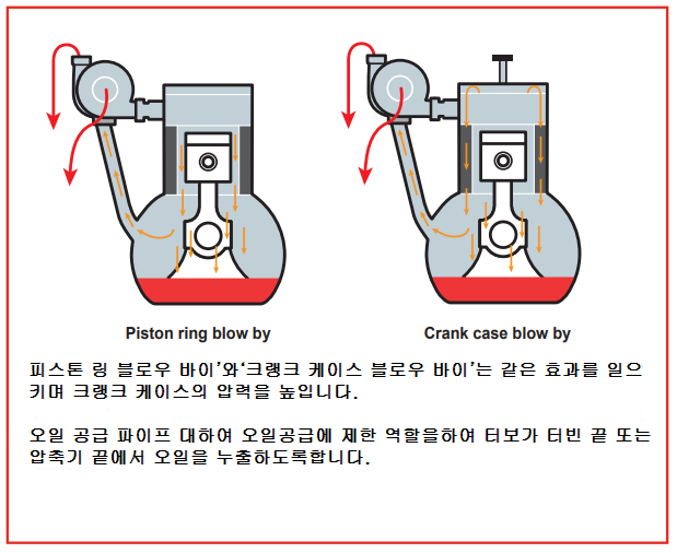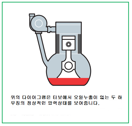 터보차저 이야기/터보차저 고장 및 대처 터보차저 하우징 오일 누유에 대하여 <명준 Turbo ATD> 명준 Turbo ATD 2021. 2. 28. 10:34 터보차저 하우징 오일 누유가 터보차저의 문제인지 아닌지를 정확히 판단하여야 합니다. 터보문의:010 6294 3481 정품신품터보(파격가)와 터보엑츄에이터 중국산터보, 모조터보,중고터보는 취급하지 않습니다. 터보고장이 나면 빠른 시간에 수리를 하거나 새로운 터보로 바꾸는 것이 실질적인 비용측면 뿐만아니라 자동차의 엔진 및 기타 부품의 손상면에서 유리합니다. 터보차저하우징 오일 누유는 아주 애매모호한 면이 많습니다. 터보차저자체의 문제일수도 있고 다른 문제일수도 있고 또는 복합적인 문제일수 있습니다. 보통 터보의 배기쪽에 오일이 보이면 터보차저의 문제로 보시면 거의 무방합니다. 아래그림은 대표적인 터보차저 누유사진 터보차저의 고장원인은 다양합니다. 주된 원인은 대부분 오일관리부실로 인한 경우입니다. 터보관련수리는 단순하게 터보차저본체의 수리뿐만 아니라 이와 관련된 원인이나 차후에 또 일어날수 있는 여러가지 정황을 정확하게 찾아내고 미리 예방점검을 하는 것이 매우 중요합니다. 터보차저는 부품값이 고가에 속하고 차종에 따라 탈부착이 쉽지 않은 까닭에 정확한 진단을 하지 못하면 이중 삼중의 비용이 발생하는 일이 생길수 있습니다. 터보고장진단과 수리중에서 가장 미묘한 부분이 터보하우징 오일 누유가 아닐까 생각됩니다. 일반적으로 터보자체의 고장때문인지 아니면 다른 원인이 누유를 발생하게 하는지 정확한 진단을 내리기가 쉽지 않기 때문입니다. 또한 신품터보를 장착하고도 누유문제가 발생한다면 당황스러운 일이 아닐수 없습니다. 터보차저누유문제를 알아보겠습니다. 터보차저가 부착된 엔진에서 엔진오일이 감소하는 현상이 나타나거나 청색매연을 배출하면 필수적으로 원인 분석을 철저하게 하여야합니다. 특히 터보차저하우징에서 오일누유현상을 보이게 되면 터보차저본체뿐만 아니라 엔진상태를 더욱 철저하게 점검하여야 합니다. 터보본체의 고장일수도 있지만 정상적인 터보에서도 단순하게는 오일과다로 인한 오일역류현상이 일어날수 있고 심각한 경우는 엔진 피스톤부분의 마모나 파손으로 인한 누유가 있을수 있기 때문입니다. 보여지는 현상을 정리하면 다음과 같습니다.(이정도의 현상이 나타나면 어느정도의 터보차저손상이 발생했다고 보시면 됩니다) 1. 오일이 터보차저의 터빈하우징이나 컴플레셔하우징면에서 새는 현상 2. 배기관에서 청색매연이 배출 3. 엔진오일이 인테이크부분이나 인터쿨러에 고여있음 4. 엔진이 힘이 없는 현상 5. 엑셀을 깊이 밟지 않았음에도 차가 뛰어나가는 현상-급발진(?) (이는 터보인터쿨러에 고여있던 오일이 엔진의 인테이크로 밀려나서 원하지 않는 연소가 발생하였기 때문입니다) 6. 디젤터보의 경우 터보본체의 가이드베인고착(이건 보통 숙련된 미케닉이 아니면 찾기가 어렵습니다) 오일 누출은 다양한 요인으로 인해 발생할 수 있으며 주요 요인은 압축기 및 터빈 하우징 안에서 발생하는 부적절한 압력에 있습니다.오일 누출은 터보차저 베어링에 치명적인 손상을 일으킬 수 있습니다.(터보 차저가 작동을 시작한 후 몇 초 이내에 발생합니다.)터보 차저가 올바르게 설치되면 오일이 새지 않아야하지만 오일누출이 발생한다면 주요 원인을 찾아내는 것이 중요합니다. 1. 표로 정리한 원인 2. 나아기기 정상적인 오일 순환 흐름 1. 터보차저의 오일 return line의 꼬임이나 막힘으로 인해 터보차저의 오일이 배출이 되지 않을 때입니다. 이렇게 되는 원인을 세부적으로 나누어 보면 1) 적절치 못한 엔진오일(대부분의 터보손상은 오일관리의 잘못이 많습니다) 2) 부실한 return line 관리(열방지 shields손상, 열로인한 변형, 눌림으로 변형등) 사실 터보차저교환시에는 오일 feed line과 return line을 신품으로 교환하는 것이 정석입니다. 최소한 터보차저교환시에는 먼저 feed line에서 오일이 유입이 잘 되는지 return line으로 오일이 잘 배출이 되는지 먼저 확인을 하는 것이 미케닉의 기본입니다. 신품터보를 장착하자말자 (짧게는 몇초) 고장을 일으키는 것이 바로 feed line에서 오일이 터보차저에 공급이 되지 않았기 때문입니다. 그 짧은 return line가 막힙니다. return line 의 중간부분을 절단면입니다. 오일관리가 부실하거나 return line관리가 잘못관리된 경우에 이런일이 발생합니다. 엄청난 터보차저누유가 발생하지요. 2. 엔진오일과다로 인한 누유 ( 오일펜쪽으로 오일흐름이 생기지 않음으로 인한 누유입니다) 3. crankshaft가 엔진오일을 계속해서 튀겨서 오일에 거품이 발생하여 터보차저에서 배출되는 오일라인에 장애가 발생되는 경우입니다. 4. 피스톤링의 마모와 crankcase내에 과다한 blow-by 에 의해 발생된 압력으로 인한 누유입니다. 주행거리가 많거나 가혹한 환경에서 엔진을 계속사용한 경우 이런 경우가 많습니다. 5. crankcase ventilation의 막힘으로 인한 crankcase내의 압력발생으로 인한 터보차저누유입니다. 이 경우 에어크리너 부근에 엔진오일이 유입이 됩니다. 6. 흡기나 배기쪽에 공