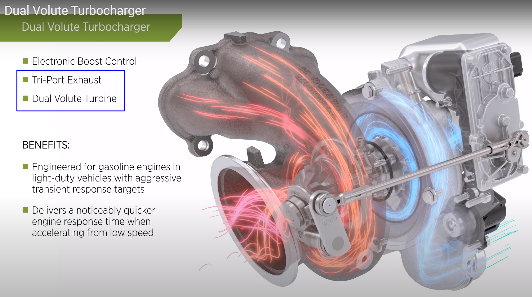 터보차저 이야기/터보차저 기술 및 정보 Dual volute turbocharger <명준 Turbo ATD> 명준 Turbo ATD 2020. 12. 4. 09:47 Dual volute turbocharger 에 대한 간략한 정보입니다. 터보관련문의: 010 6294 3481 정품신품터보와 터보엑츄에이터 중국산터보, 모조터보, 중고터보는 취급하지 않습니다. 차대번호 또는 엔진형식으로 문의하시면 정확한 정보를 드릴수 있습니다. 승용차 가솔린 엔진용 Dual volute turbocharger 저속시에 많은 터빈 에너지를 이용함으로써 뛰어난 터보차저 부스트 응답성을 가능하게 해 터보차저 엔진에 요구되고있는 빠른 응답성을 실현한 것이 특징.(improving transient response by up to 30% over comparable twin scroll and VTG designs.) 관련동영상 배기를 두 개의 volute로 분리 트윈 스크롤 터보차저 구조에 비해 터빈 휠 구동으로 보다 많은 exhaust pulsations 에너지를 이용 Dual volute turbocharger 기술은 격벽을 제거하고 배기통로를 완전히 분리함으로써 보다 많은 배기가스를보내는 구조 공유하기 게시글 관리 MJATD 명준터보 - 정품터보차저 전문판매점 저작자표시 비영리 변경금지 (새창열림) '터보차저 이야기 > 터보차저 기술 및 정보' 카테고리의 다른 글 트윈터보(Twin turbo)에 대하여<명준 Turbo ATD> (0) 2020.10.20 터보차저와 엔진(압축비)과의 관련에 대하여<명준 Turbo ATD> (0) 2020.07.17 콘티넨탈 터보차저(continental turbocharger)<명준 Turbo ATD> (0) 2020.07.14 보그워너 R2S® Turbocharging Technology <명준 Turbo ATD> (0) 2020.07.05 EGR(Exhaust Gas Recirculation)에 대하여-터보차저정보<명준 Turbo ATD> (0) 2020.06.23 '터보차저 이야기/터보차저 기술 및 정보' Related Articles 트윈터보(Twin turbo)에 대하여<명준 Turbo ATD> 터보차저와 엔진(압축비)과의 관련에 대하여<명준 Turbo ATD> 콘티넨탈 터보차저(continental turbocharger)<명준 Turbo ATD> 보그워너 R2S® Turbocharging Technology <명준 Turbo ATD>